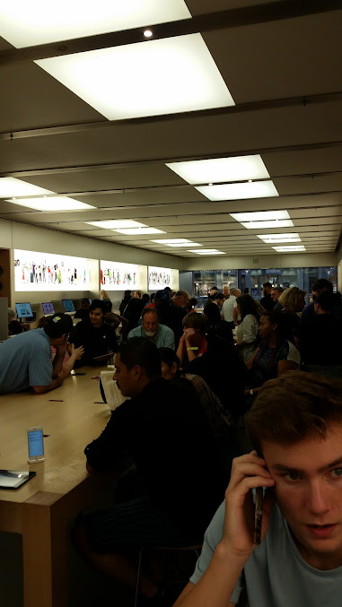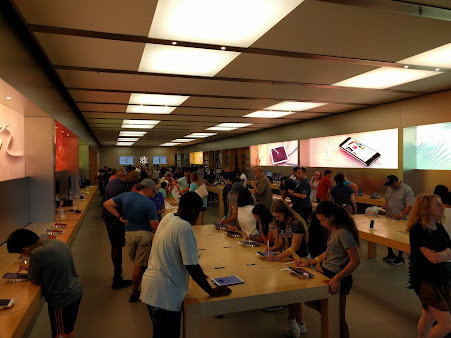 Eh, I'm personally not an Apple fan ever since they got caught slowing down older phones but my niece wanted to go in so we went in. It was Packed and hot. The staff was fine not super excited but not rude. It was cool that they rang us up in the middle of the store on a tablet, no waiting in line, that was a definite plus!!!