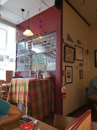 Great burgers hang out place. Great for the family. Something for everyone. Little hot wheel collection on the wall in the front.